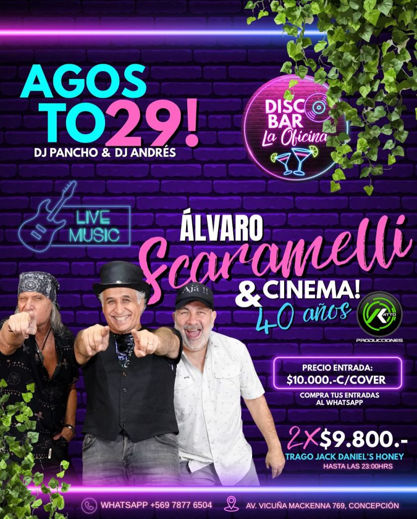 "NO TE PIERDAS EL REGRESO DE ÁLVARO SCARAMELLI Y CINEMA CELEBRANDO 40 AÑOS DE EXITOS"Vive una noche única llena de nostalgia y grandes hits junto a una de las leyendas del Rock latino Chileno